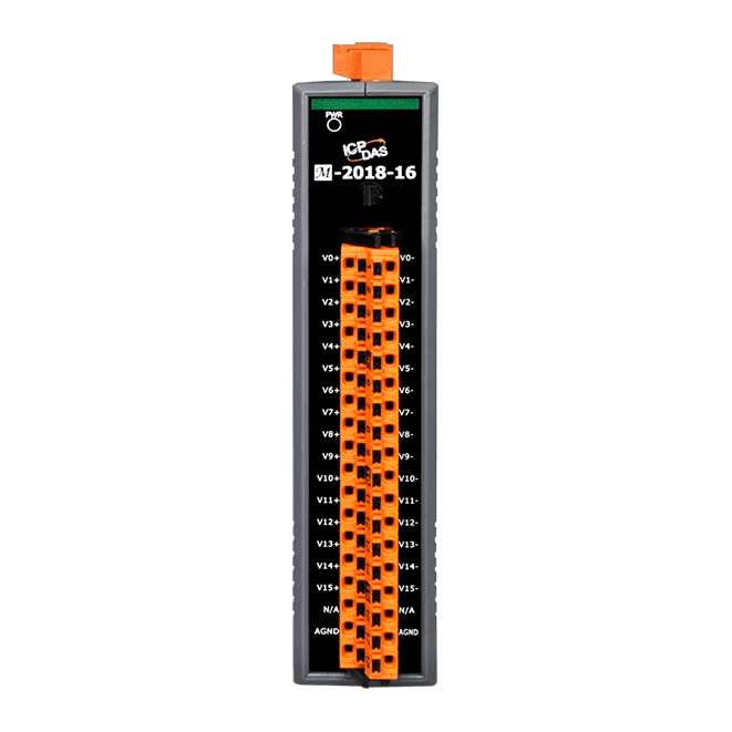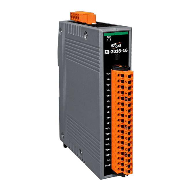 The M-2018-16 is an analog input module that includes 16 differential input channels. The voltage input range can be from ±15 mV to ±2.5 V, the current input range can be either +4 to +20 mA, 0 to +20 mA, or ±20 mA, and types J, K, T, E, R, S, B, N, C, L, M, LDIN43710 thermocouple can be used for the thermocouple input. Overvoltage protection of up to 120 VDC is provided. The module also features per-channel open wire detection for the thermocouple input types, and provides 4 kV ESD protection as well as 3000 VDC intra-module isolation.